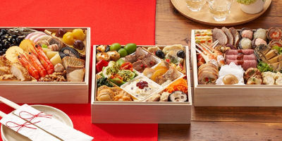 | お品書き(一部抜粋) | 国産牛肉のしぐれ煮、茨城県石岡市産栗の栗きんとん(栗2粒入)、国産椎茸煮、国産さつま芋の甘煮、丹波篠山市産黒豆煮、栃木県産大豆の巻き湯葉煮、国産野菜の紅白なます、北海道産かぼちゃの伊達巻風、国産ごぼうのたたきごぼう、国産金柑の甘露煮、大分県佐伯市産ぶりの照焼、佐賀県産若鶏の唐揚げ、国産金柑の甘露煮、宮崎県産若鶏のミートボールと野菜の甘酢和え、平田牧場三元豚の角煮、北海道産紫花豆煮、国産野菜の炊き合わせ(別添) |