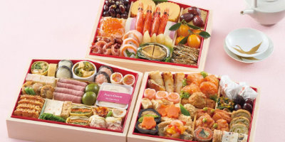 二の重:和牛ローストビーフ、芝海老伊達巻き、鮭の砧巻き、本ずわい蟹のテリーヌ、銀ダラ粕漬け、三河産こはだ土佐酢漬け、金柑蜜煮、国産栗のきんとん、スモークサーモン、やわらか蒸し鶏の葱ソース 三の重: ごぼう旨煮、竹の子旨煮、海老だんご含ませ煮、車海老旨煮、浜名湖産うなぎの蒲焼き、こんにゃく山椒煮、北海道産ほたて旨煮、京丹波産大黒本しめじ旨煮、北海道産つぶ貝の煮付け、本ずわい蟹甘酢漬け、椎茸つや煮、たこ旨煮、人参梅煮 |